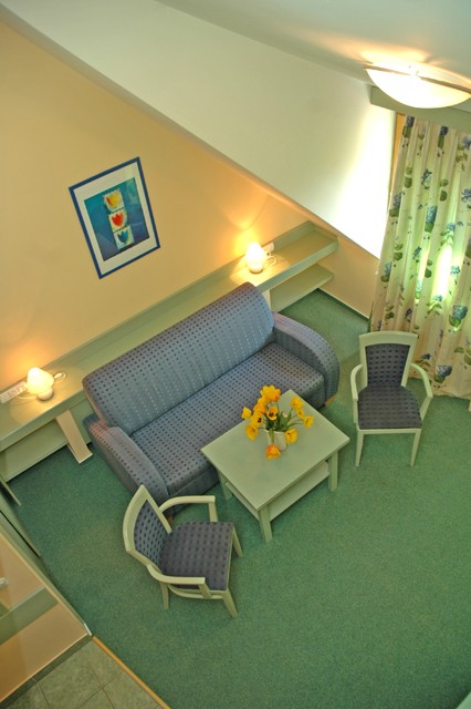 Négyfős és hatfős apartmanok: franciaágyas hálórész (az apartmanok többségében galérián), kihúzható kétfős kanapé (négyfős apartmanban a nappali részen, többnyire egy légtérben a franciaágyas hálórésszel), erkély vagy terasz (a szobák egy részében), a hatfős apartmanban még egy franciaágyas hálórész (általában egy légtérben a többi hálóhellyel), zuhanyzó és WC, konyhasarok tűzhellyel, kávéfőzővel és kenyérpirítóval, étkezősarok, TV, hajszárító.